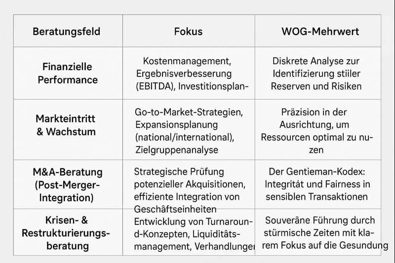 Mit Weitblick, Integrität und Umsetzungsstärke begleiten wir Entscheider dabei, fundierte Entscheidungen zu treffen, Komplexität zu beherrschen und ihr Unternehmen langfristig erfolgreich auszurichten.